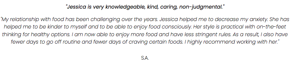 My nutrition philosophy is rooted in an “all foods fit” approach. This means that I won’t tell you to stop eating your favorite dessert or to restrict certain foods altogether. Each food has a place in a balanced diet, and together we will find a balance that works for you.